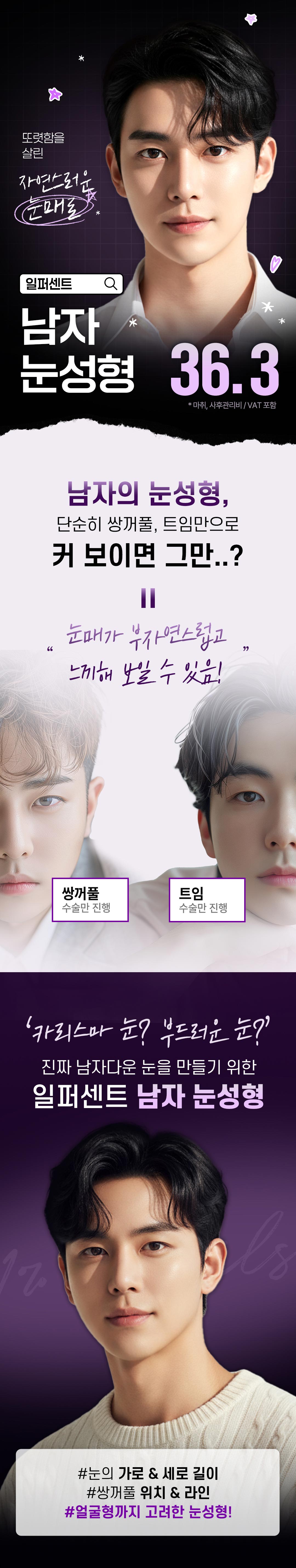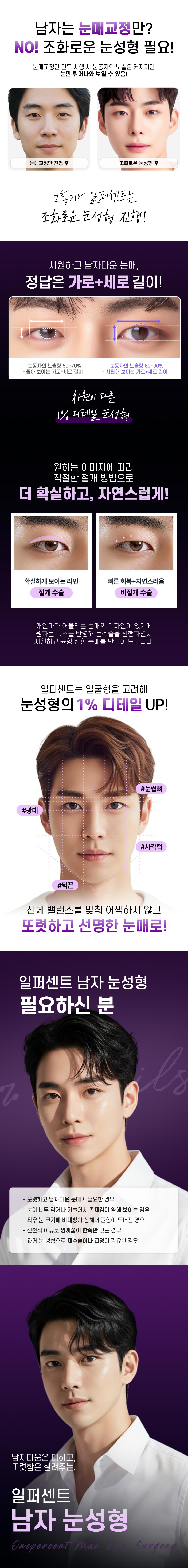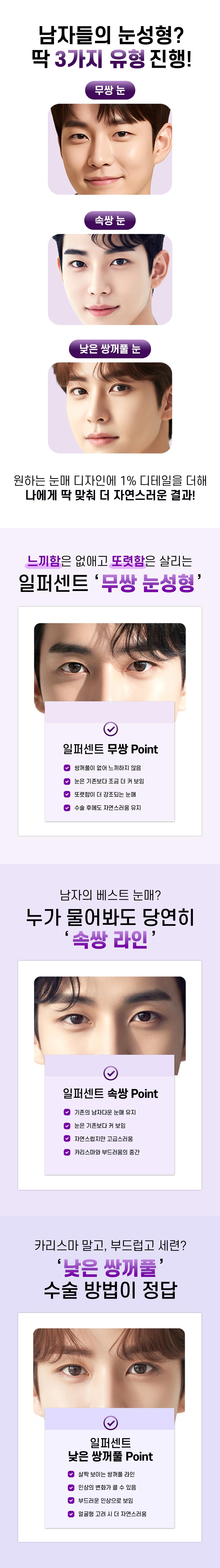 일퍼센트 남자 눈성형은 주로 쌍꺼풀 수술을 포함하여 눈매를 개선하는 시술입니다. 상담 후 개인의 눈 형태와 원하는 결과에 맞춰 맞춤형으로 진행됩니다.