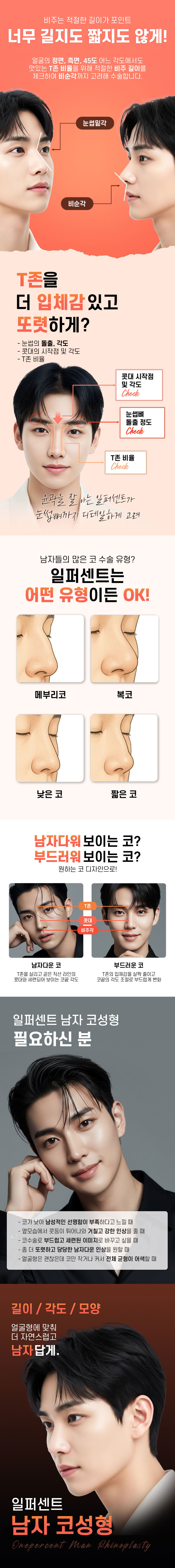 일퍼센트 남자 코성형은 개인의 얼굴 비율과 조화를 고려한 맞춤형 설계로 진행됩니다. 수술 전 상담을 통해 디자인을 결정하고, 수술은 약 2~3시간 소요됩니다.