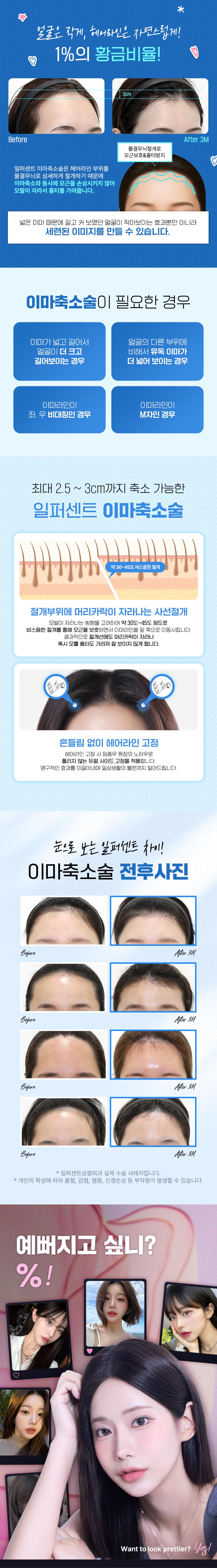 일퍼센트_이마축소술은 이마의 과도한 피부를 절제하여 이마의 높이를 줄이는 수술입니다. 절개한 부위를 봉합하며, 시술은 일반적으로 1~2시간 정도 소요됩니다.