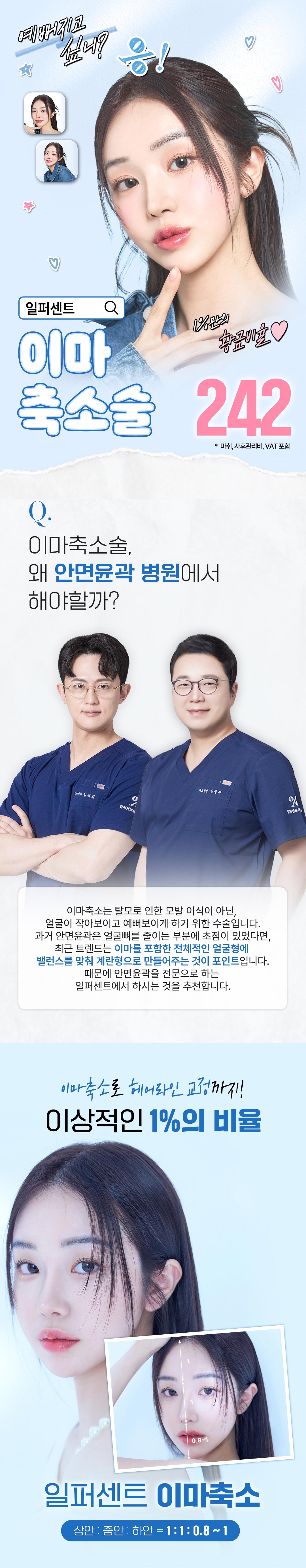일퍼센트_이마축소술의 비용은 2,420,000원입니다. 이는 병원 정책에 따라 달라질 수 있으며, 상담 시 정확한 견적을 받을 수 있습니다.