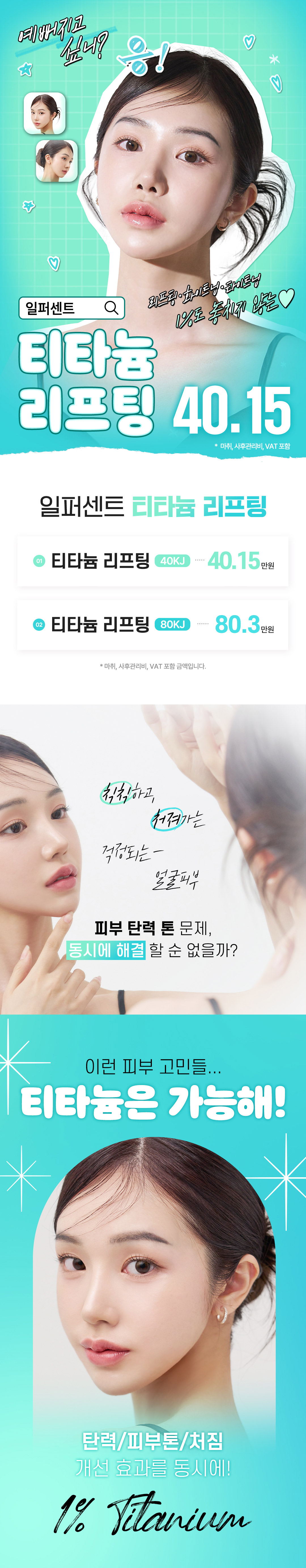 일퍼센트성형외과에서 진행하는 티타늄 리프팅 시술은 40KJ와 80KJ 두 가지 옵션이 있으며, 가격은 401,500원입니다. 정확한 비용은 상담 후 결정될 수 있습니다.