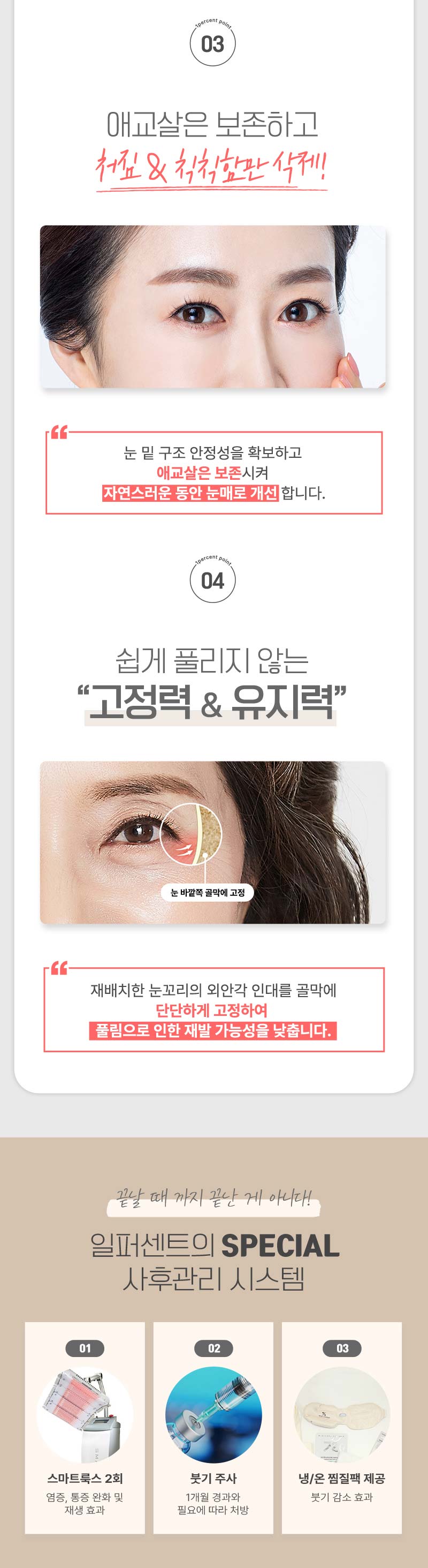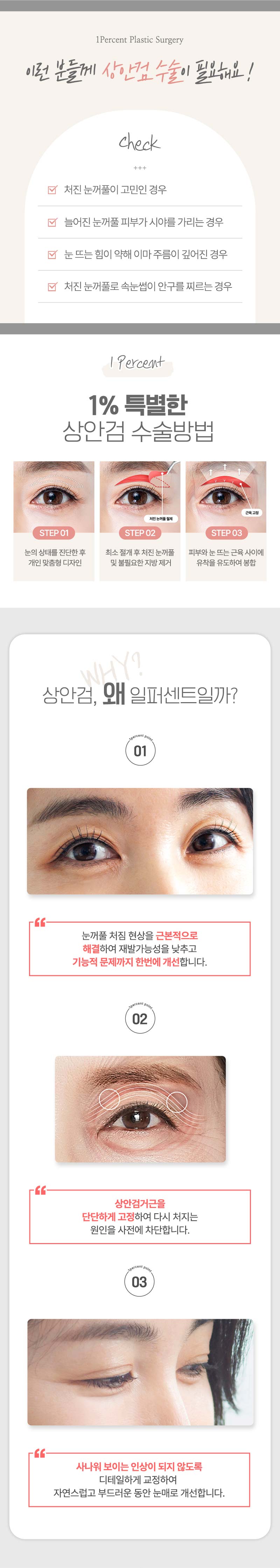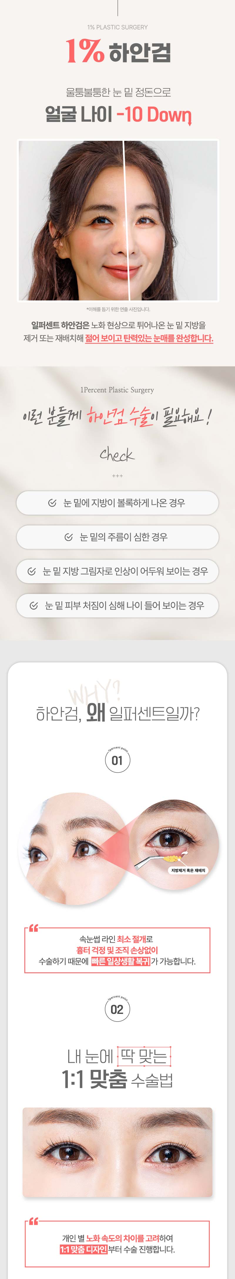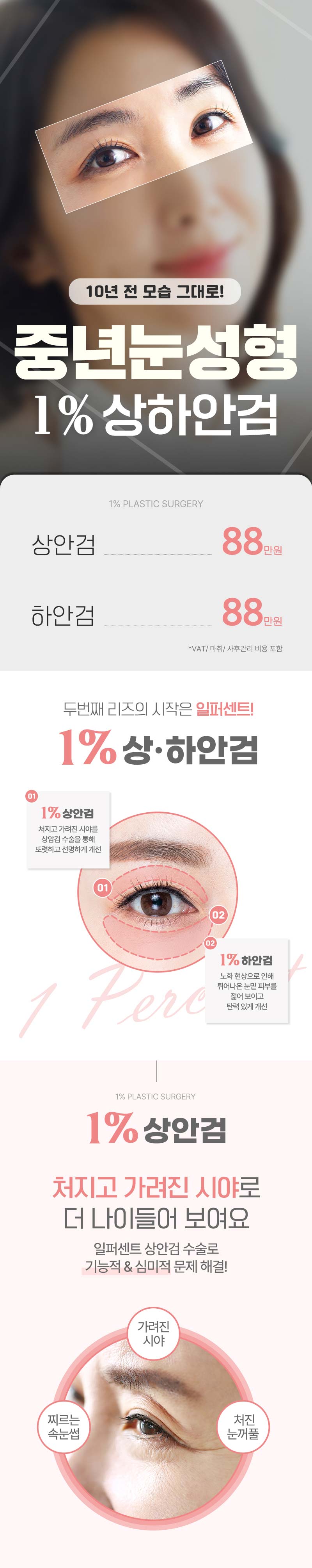 일퍼센트_중년눈성형은 상안검과 하안검을 포함하여 눈 주변의 처진 피부와 주름을 개선하는 시술입니다. 국소 마취 후 수술이 진행되며, 불필요한 피부와 지방을 제거하여 보다 젊고 생기 있는 눈매를 만들어 줍니다.